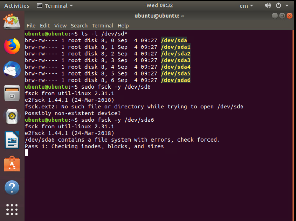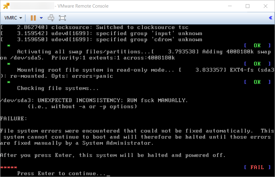 - Użyj komendy sudo fsck /dev/sdaX (gdzie X to numer partycji jaki zgłaszała błąd podczas startu NSX Managera)