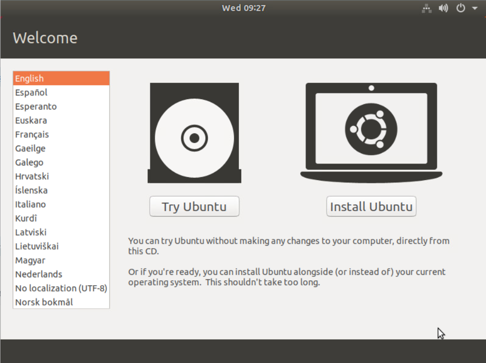- Wciśnij przycisk “Try Ubuntu” i po załadowania GUI uruchom terminal