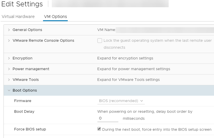 - Wymuś w konfiguracji maszyny start BIOSU przy następnym restarcie