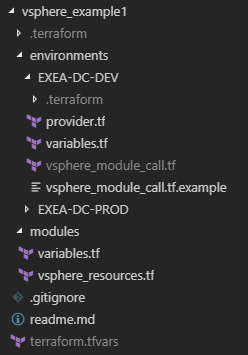 Robię to używając pliku “vsphere_example1\environments\EXEA-DC-DEV\vsphere_module_call.tf” wywołującego moduł do którego podawane są wartości jakie podać mogę ręcznie: