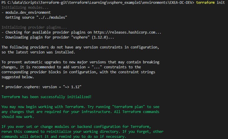 Zanim oczywiście wykonamy pierwsze wdrożenie za pomocą terraforma najpierw należy zainicjować providera jakiego zadeklarowaliśmy w pliku konfiguracyjnym “vsphere_example1\environments\EXEA-DC-DEV\provider.tf”