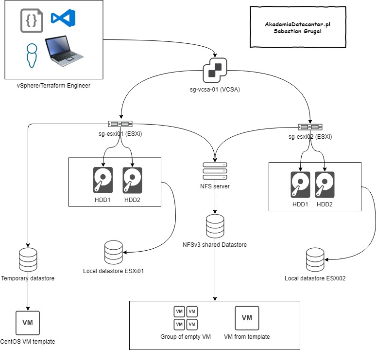- w moim scenariuszu będę korzystał z template maszyny wirtualnej, który wcześniej wrzuciłem już na tymczasowy datastor NFS, który podpiąłem do jednego z ESXi