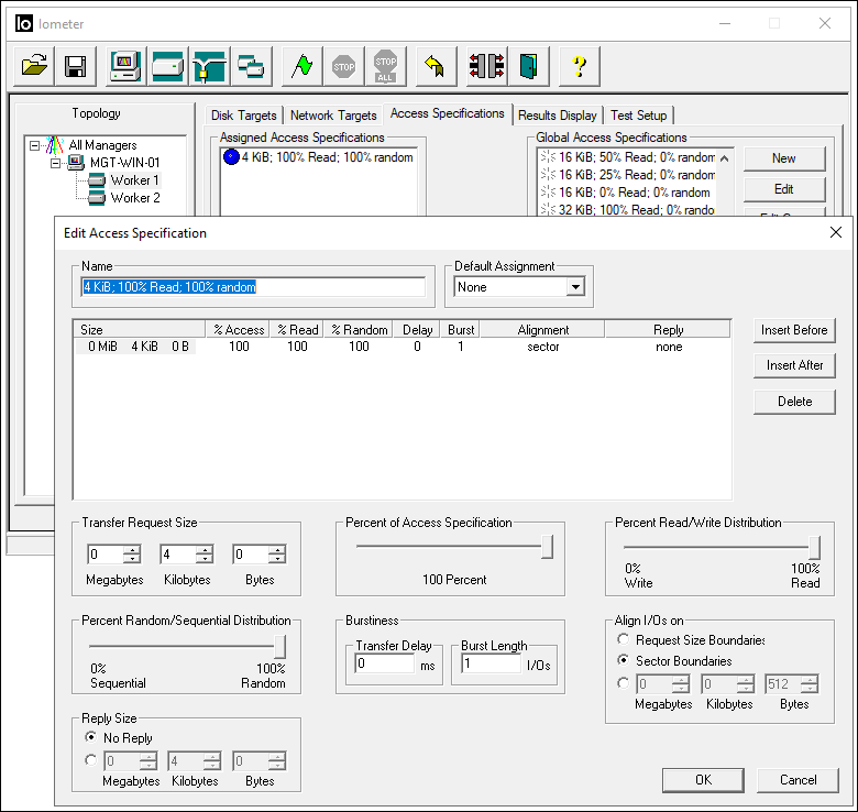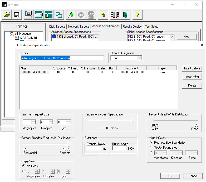 Iometer pozwala na przeprowadzenie testów losowego i sekwencyjnego dostępu do dysku, które różnią się pod względem wymagań i obciążenia: