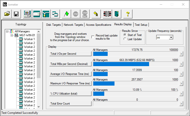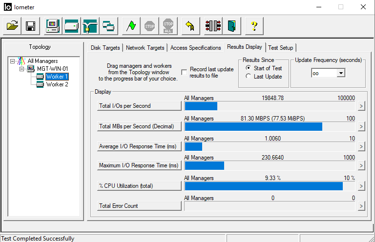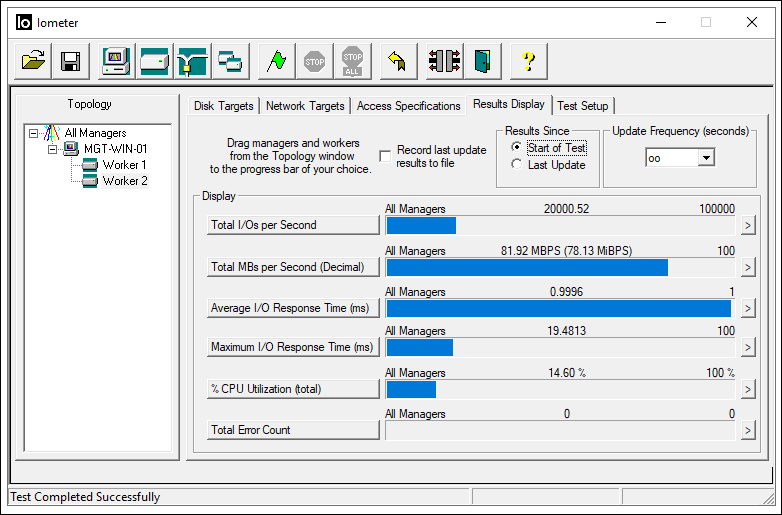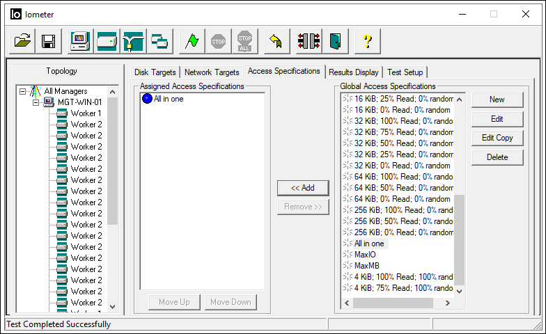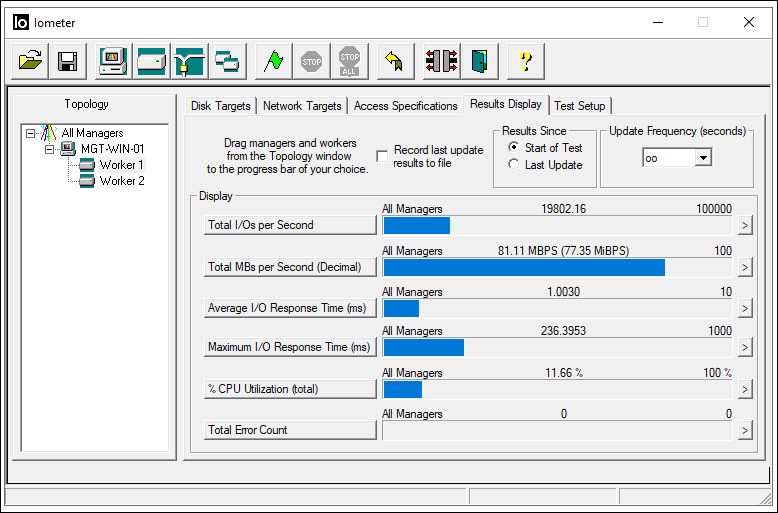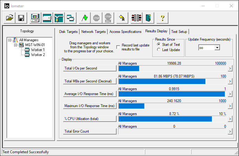 - Testy mieszane odczytu i zapisu: Można skonfigurować Iometer do równoczesnego przeprowadzania operacji odczytu i zapisu w jednym teście, co dokładnie odwzorowuje obciążenie systemu w zastosowaniach bazodanowych.