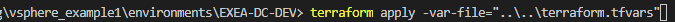 Terraforma uruchamiamy wywołaniem w katalogu “vsphere_example1\environments\EXEA-DC-DEV” z referencją do pliku terraform.tfvars, który lokalnie przechowuje “credentiale” do środowiska vSphere